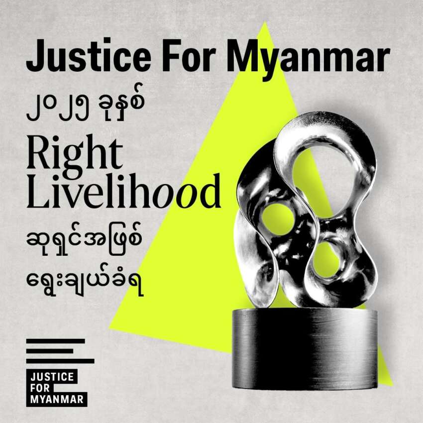 Right Livelihood Award သည် လူသားအားလုံးအတွက် ငြိမ်းချမ်းရေး၊ တရားမျှတမှုနှင့် ရေရှည်တည်တံ့မှုတို့အတွက် ကြိုးပမ်းဆောင်ရွက်သော ကမ္ဘာတဝန်းက အပြောင်းအလဲ ဖော်ဆောင်နိုင်သူ/ အဖွဲ့အစည်းများကို အသိအမှတ်ပြု ပေးအပ်ခြင်းဖြစ်ပြီး၊ ယခုနှစ် ၂၀၂၅ ခုနှစ်အတွက် ပစိဖိတ်ကျွန်းစု၊ ထိုင်ဝမ်နဲ့ ဆူဒန်တို့မှ ဆုရှင် သုံးဦးနှင့်အတူ Justice For Myanamr ကို အသိအမှတ်ပြုပေးအပ်ခဲ့ခြင်းဖြစ်ကြောင်းလည်း သိရသည်။