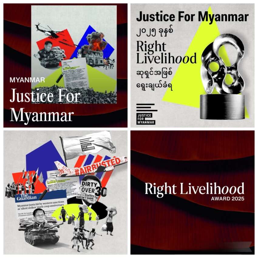 မြန်မာစစ်အုပ်စုကို သက်ဆိုးရှည်စေရန် အားပေးကူညီနေသည့် ငွေကြေးကွန်ရက်များအား ဖြိုဖျက်နိုင်ရေး ကြိုးပမ်းအားထုတ်မှုများကို အလေးထား အသိအမှတ်ပြုသည့်အနေဖြင့် Justice For Myanmar အဖွဲ့အား ၂၀၂၅ ခုနှစ်အတွက် ဂုဏ်သိက္ခာကြီးမားသော Right Livelihood Award ဆု ပေးအပ်ချီးမြှင့်ခဲ့မှုအပေါ် နိုင်ငံတကာမီဒီယာများက ဂုဏ်ပြုဖော်ပြခဲ့ကြသည်။