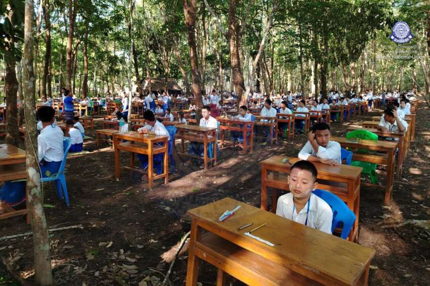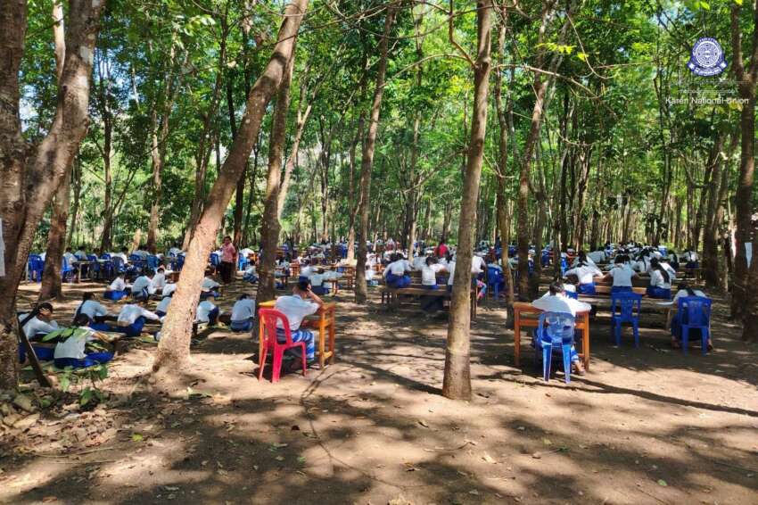 ဓာတ်ပုံ- စစ်တပ်၏ လေကြောင်းတိုက်ခိုက်မှုနှင့် ပစ်ခတ်မှုများအကြား KNU ထိန်းချုပ်နယ်မြေအတွင်း ရသည့်ပုံစံဖြင့် ဖွင့်လှစ်သင်ကြားနေသည့် စာသင်ခန်းများ။