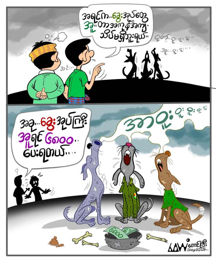 News “အူလွန်းသောခွေး ၆၈၀၀ ပေး” By Yangon Khit Thit News Agency October 5, 2025 0 14 Share FacebookTwitterPinterestWhatsAppLinkedinPrintTelegramCopy URL Must read မြန်မာနိုင်ငံတစ်ဝန်း စစ်ကောင်စီတပ်ဖွဲ့ဝင် ၄၇ ဦးသေဆုံး October 5, 2025 မင်းတုန်းမြို့နယ်၊ ခုန်တိုင်ရွာအနီး တိုက်ပွဲဖြစ်ပွားပြီး စစ်တပ်ဘက်မှ ထိခိုက်သေဆုံးမှုရှိ၊ စစ်တပ်က လူငယ်များကို ပေါ်တာဆွဲ ဖမ်းဆီးကာ နေအိမ်များရှိ ပစ္စည်းများကိုလည်း ခိုးယူလုယက်သွား October 5, 2025 မင်းတုန်းမြို့နယ်၊ ခုန်တိုင်ရွာအနီး တိုက်ပွဲဖြစ်ပွားပြီး စစ်တပ်ဘက်မှ ထိခိုက်သေဆုံးမှုရှိ၊ စစ်တပ်က လူငယ်များကို ပေါ်တာဆွဲ ဖမ်းဆီးကာ နေအိမ်များရှိ ပစ္စည်းများကိုလည်း ခိုးယူလုယက်သွား October 5, 2025 တောင်ကိုရီးယားနိုင်ငံ ဒါဆန်းမြို့တွင် မြန်မာနိုင်ငံ စစ်အာဏာသိမ်းမှုအလိုမရှိ ဆန့်ကျင်ဆန္ဒပြ October 5, 2025 Yangon Khit Thit News Agency ကာတွန်း-ဝေယံတောင်ကြီး။ Tagskhit thit news Share FacebookTwitterPinterestWhatsAppLinkedinPrintTelegramCopy URL Previous articleထားဝယ်ထောင်တွင် နိုင်ငံရေးအကျဥ်းသား ဦးအောင်ကိုဦး ကျန်းမာရေး ဆိုးဝါးလာချိန် ဆေးကုသခွင့် မရ၍ သေဆုံးNext articleစစ်ကိုင်းနှင့် မတ္တရာမြို့နယ်အကြား ဧရာ၀တီမြစ်အတွင်း ကျောက်ချထားသော စစ်သင်္ဘောက လက်နက်ကြီးများဖြင့် ကျေးရွာများကို ပစ်ခတ်၊ ပြည်သူများစွာ ထွက်ပြေးတိမ်းရှောင်နေရ - Advertisement - More articles မင်းတုန်းမြို့နယ်၊ ခုန်တိုင်ရွာအနီး တိုက်ပွဲဖြစ်ပွားပြီး စစ်တပ်ဘက်မှ ထိခိုက်သေဆုံးမှုရှိ၊ စစ်တပ်က လူငယ်များကို ပေါ်တာဆွဲ ဖမ်းဆီးကာ နေအိမ်များရှိ ပစ္စည်းများကိုလည်း ခိုးယူလုယက်သွား October 5, 2025 မင်းတုန်းမြို့နယ်၊ ခုန်တိုင်ရွာအနီး တိုက်ပွဲဖြစ်ပွားပြီး စစ်တပ်ဘက်မှ ထိခိုက်သေဆုံးမှုရှိ၊ စစ်တပ်က လူငယ်များကို ပေါ်တာဆွဲ ဖမ်းဆီးကာ နေအိမ်များရှိ ပစ္စည်းများကိုလည်း ခိုးယူလုယက်သွား October 5, 2025 ရွှေဘိုမြို့နယ်၊ ဇီးကုန်းလေး ပျူစောထီးရွာရှိ စစ်တပ် ကင်းစခန်းတစ်ခုကို ဝင်ရောက်တိုက်ခိုက်မှု စစ်တပ်ဘက်မှ ၂ ဦးသေဆုံးပြီး လက်နက် ၃ လက်နှင့်ခဲယမ်းများ သိမ်းဆည်းရရှိ၊ စခန်းကိုလည်း မီးရှို့ရှင်းလင်း October 5, 2025 LEAVE A REPLY Cancel reply Comment: Please enter your comment! Name:* Please enter your name here Email:* You have entered an incorrect email address! Please enter your email address here Website: Save my name, email, and website in this browser for the next time I comment. - Advertisement - Latest article မြန်မာနိုင်ငံတစ်ဝန်း စစ်ကောင်စီတပ်ဖွဲ့ဝင် ၄၇ ဦးသေဆုံး October 5, 2025 မင်းတုန်းမြို့နယ်၊ ခုန်တိုင်ရွာအနီး တိုက်ပွဲဖြစ်ပွားပြီး စစ်တပ်ဘက်မှ ထိခိုက်သေဆုံးမှုရှိ၊ စစ်တပ်က လူငယ်များကို ပေါ်တာဆွဲ ဖမ်းဆီးကာ နေအိမ်များရှိ ပစ္စည်းများကိုလည်း ခိုးယူလုယက်သွား October 5, 2025 မင်းတုန်းမြို့နယ်၊ ခုန်တိုင်ရွာအနီး တိုက်ပွဲဖြစ်ပွားပြီး စစ်တပ်ဘက်မှ ထိခိုက်သေဆုံးမှုရှိ၊ စစ်တပ်က လူငယ်များကို ပေါ်တာဆွဲ ဖမ်းဆီးကာ နေအိမ်များရှိ ပစ္စည်းများကိုလည်း ခိုးယူလုယက်သွား October 5, 2025 တောင်ကိုရီးယားနိုင်ငံ ဒါဆန်းမြို့တွင် မြန်မာန
