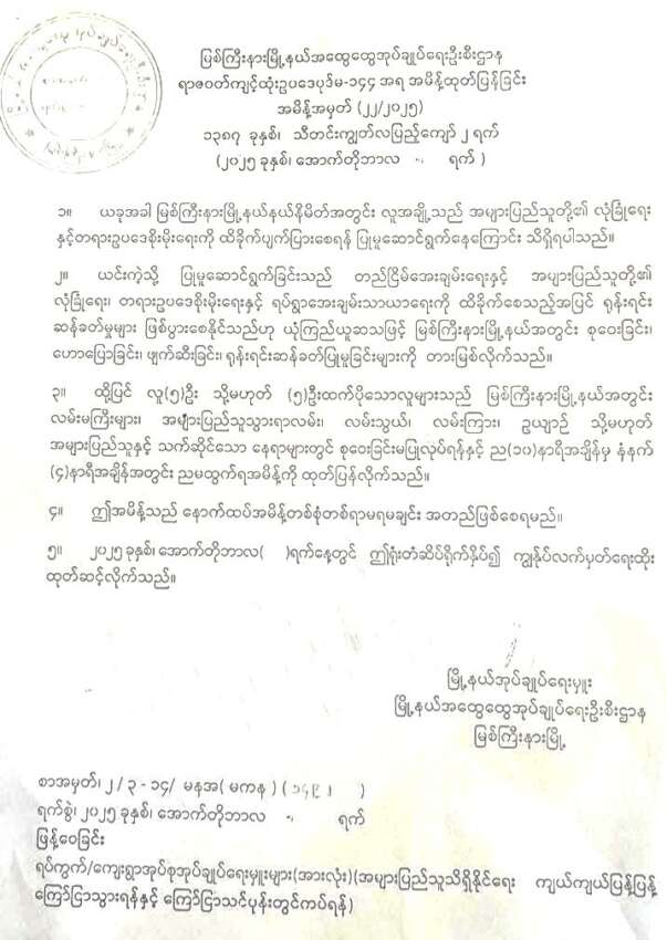 စစ်အုပ်ချုပ်ရေး ရုပ်သိမ်းပြီးနောက် မြစ်ကြီးနားနှင့် ဖားကန့်မြို့နယ်တို့တွင် စစ်တပ်က ညမထွက်ရ အမိန့် ပြန်လည် ထုတ်ပြန်