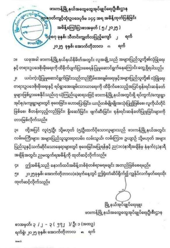 ကချင်ပြည်နယ်၊ မြစ်ကြီးနားမြို့နှင့် ဖားကန့်မြို့နယ်တို့တွင် အကြမ်းဖက်စစ်တပ် လက်အောက်ခံ အထွေထွေအုပ်ချုပ်ရေးဦးစီး ဌာနက ရာဇဝတ် ကျင့်ထုံးဥပဒေပုဒ်မ ၁၄၄ ဖြင့် ညမထွက်ရ အမိန့်ကို အောက်တိုဘာလ ၈ ရက်နေ့တွင် ပြန်လည် ထုတ်ပြန်လိုက်ကြောင်း သိရှိရသည်။