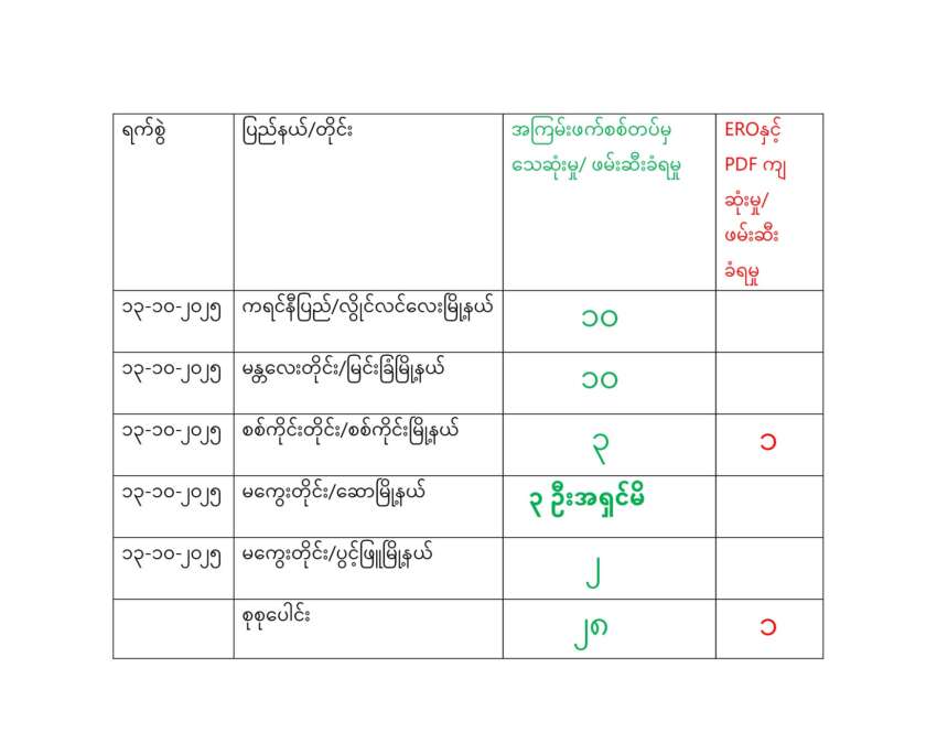 မြန်မာနိုင်ငံတစ်ဝန်း အောက်တိုဘာလ ၁၃ ရက်နေ့ ရရှိထားသော အချက် အလက်များအရ စစ်ကောင်စီတပ်ဖွဲ့ဝင် ၂၅ ဦး သေဆုံးကြောင်း ပြည်သူ့ကာကွယ်ရေးတပ်ဖွဲ့များ၏ ထုတ်ပြန်ချက်နှင့် ပြောဆို ချက် များ အရ သိရှိရသည်။