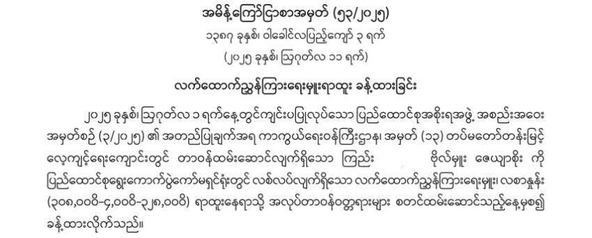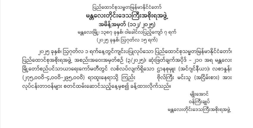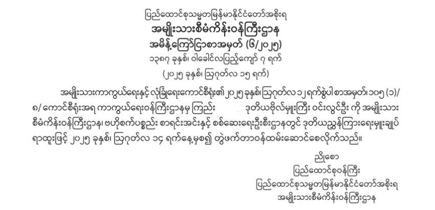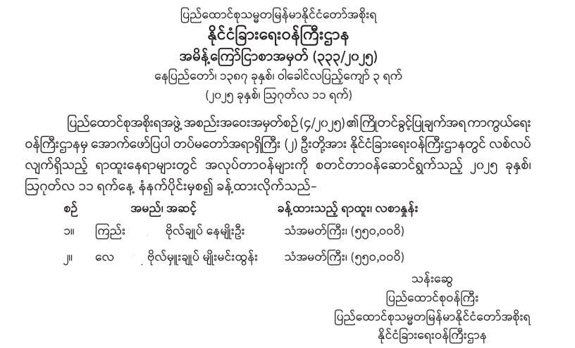 အလားတူပင် တပ်မတော်(ကြည်း)မှ ဒုတိယဗိုလ်မှူးကြီး ဝင်းလွင်ဦးကို အမျိုးသားစီမံကိန်းဝန်ကြီးဌာန၊ ဗဟိုစက်ပစ္စည်းစာရင်းအင်းနှင့်စစ်ဆေးရေးဦးစီးဌာန၊ ဒုတိယညွှန်ကြားရေးမှူးချုပ်အဖြစ်လည်းကောင်း၊ ဗိုလ်ကြီး မင်းသူကို မန္တလေးစည်ပင်ဌာနမှူးအဖြစ်လည်းကောင်း၊ အမှတ် ၁၃ တန်းမြင့် လေ့ကျင့်ရေးမှ ဗိုလ်မှူး ဇေယျာစိုးကို ရွေးကောက်ပွဲကော်မရှင်တွင် လက်ထောက်ညွှန်ကြားရေးမှူးအဖြစ် လည်းကောင်း ခန့်အပ်ခဲ့ကြောင်း သိရှိရသည်။