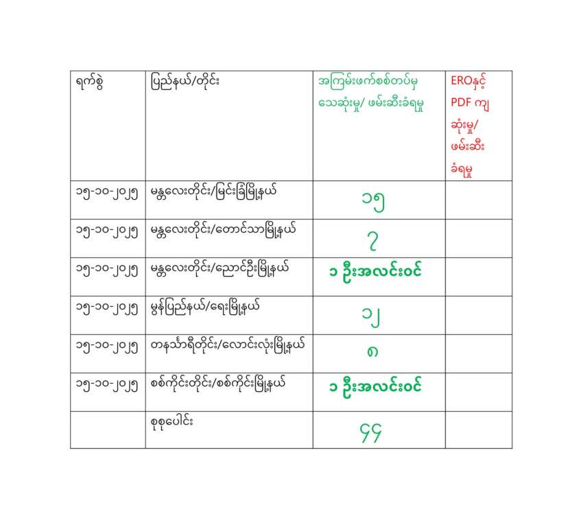 မြန်မာနိုင်ငံတစ်ဝန်း အောက်တိုဘာလ ၁၅ ရက်နေ့ ရရှိထားသော အချက်အလက်များအရ စစ် ကောင်စီတပ်ဖွဲ့ဝင် ၄၂ ဦး သေဆုံးကြောင်း ပြည်သူ့ကာကွယ်ရေးတပ်ဖွဲ့များ၏ ထုတ်ပြန်ချက်နှင့် ပြောဆို ချက် များ အရ သိရှိရသည်။