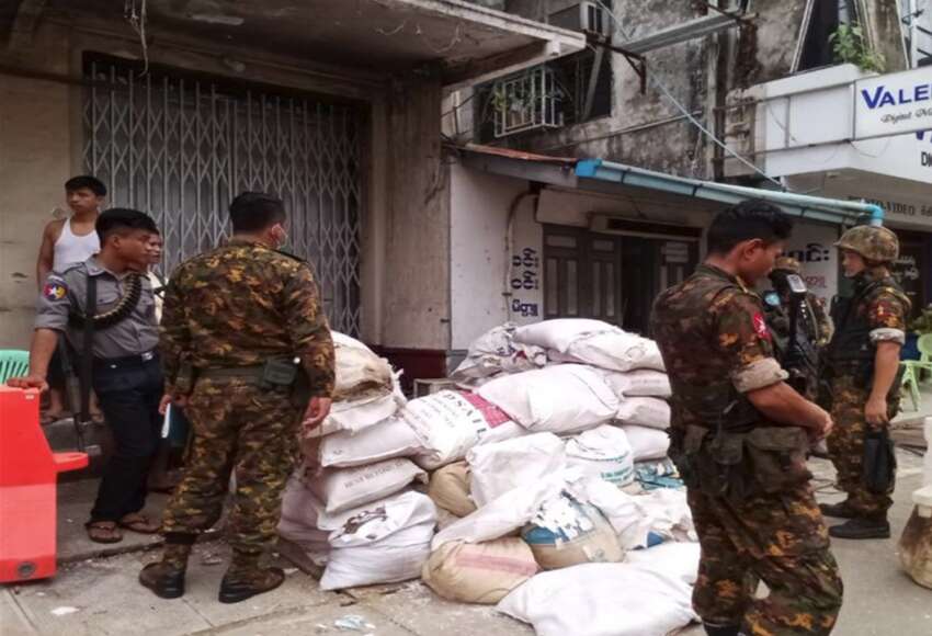 ဓာတ်ပုံ- ရန်ကုန်တွင် အုပ်ချုပ်ရေးမှူးရုံးများကို လုံခြုံရေးယူ တပ်စွဲလေ့ရှိသည့် အကြမ်းဖက်စစ်တပ်နှင့်ရဲများ။ (ပုံအဟောင်းဖြစ်ပါသည်။)