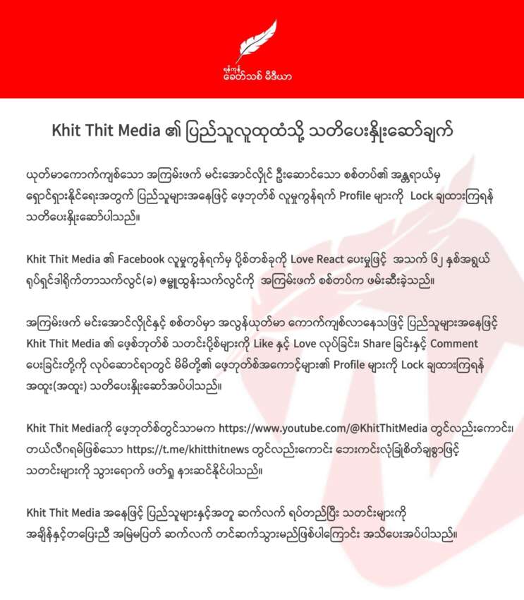 အကြမ်းဖက် မင်းအောင်လှိုင်နှင့် စစ်တပ်မှာ အလွန်ယုတ်မာ ကောက်ကျစ်လာနေသဖြင့် ပြည်သူများအနေဖြင့် Khit Thit Media ၏ ဖေ့စ်ဘုတ်စ် သတင်းပို့စ်များကို Like နှင့် Love လုပ်ခြင်း၊ Share ခြင်းနှင့် Comment ပေးခြင်းတို့ကို လုပ်ဆောင်ရာတွင် မိမိတို့၏ ဖေ့ဘုတ်စ်အကောင့်များ၏ Profile များကို Lock ချထားကြရန် အထူး(အထူး) သတိပေးနှိုးဆော်အပ်ပါသည်။