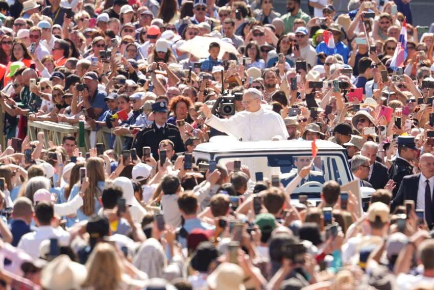 Pope Leo XIV greets people at the conclusion of his inauguration Mass in St. Peter’s Square at the Vatican May 18, 2025. (CNS photo/Lola Gomez)