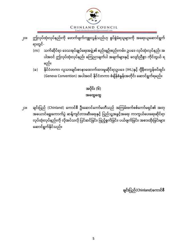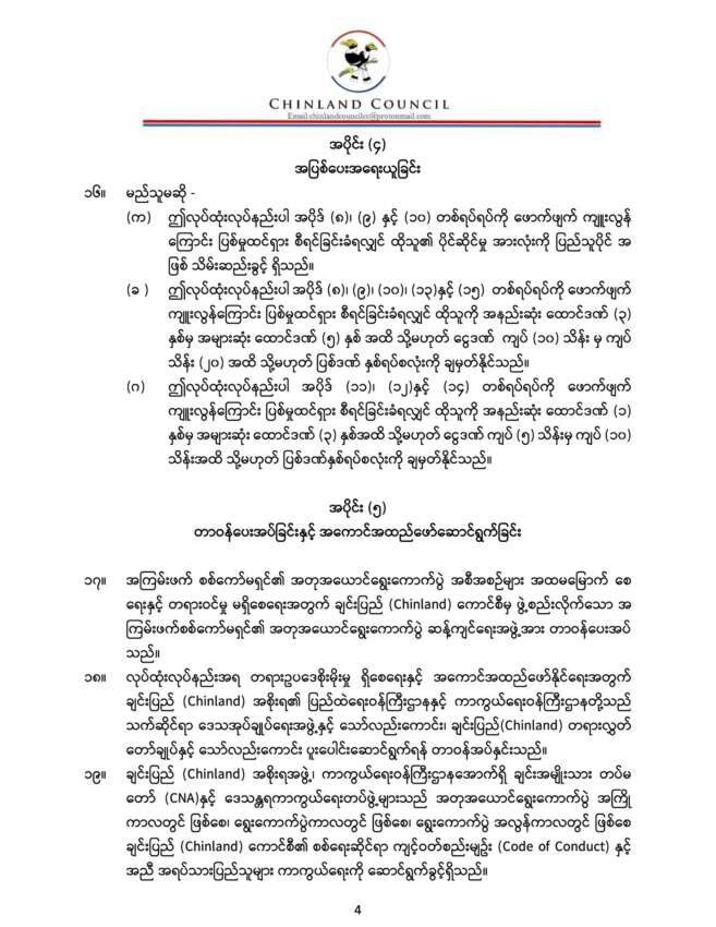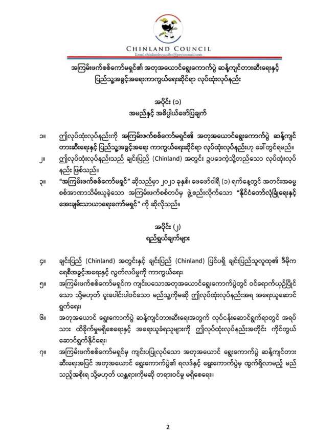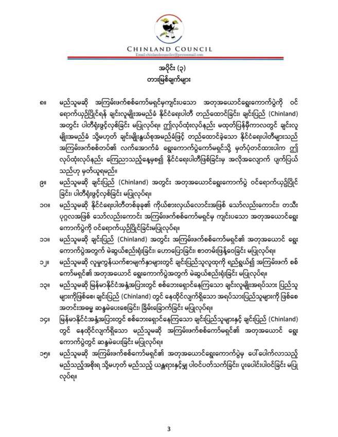 စစ်ကော်မရှင်ရဲ့ အတုအယောင်ရွေးကောက်ပွဲကို ဆန့်ကျင်တားဆီးဖို့နဲ့ ပြည်သူ့အခွင့်အရေးကာကွယ်ရေးဆိုင်ရာ လုပ်ထုံးလုပ်နည်းကို ချင်းပြည်ကောင်စီ(Chinland Council)က မနေ့က ထုတ်ပြန်ထားလိုက်ပြီး အဲ့ဒီလုပ်ထုံးလုပ်နည်းထဲ တားမြစ်ချက်တွေ အပါအဝင် အပိုင်း ၆ ခု ပါဝင်ပါတယ်။