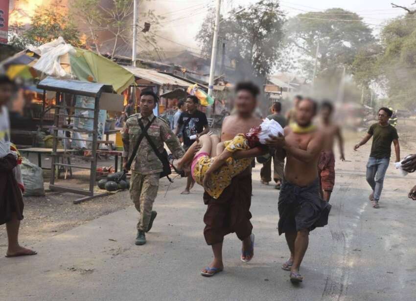 ဓာတ်ပုံ – မန္တလေးတိုင်းအတွင်း စစ်တပ်၏ လေကြောင်းတိုက်ခိုက်မှုကြောင့် ပြည်သူများ ထိခိုက်ဒဏ်ရာရရှိပြီး နေအိမ်များ ပျက်စီး မီးလောင်နေစဉ်။ (ပုံအဟောင်းဖြစ်ပါသည်။)