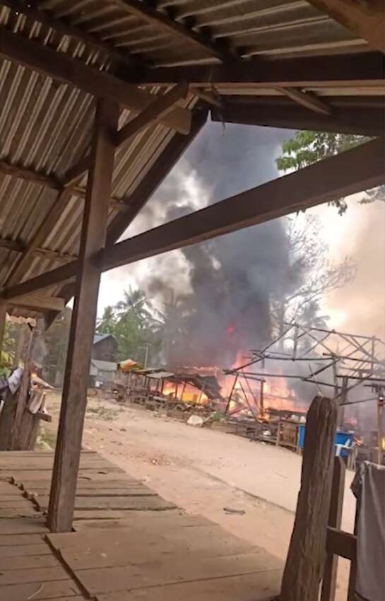 ဓာတ်ပုံ – အညာဒေသတွင် စစ်တပ်၏ ပစ်ခတ်တိုက်ခိုက်မှုကြောင့် ပြည်သူပိုင်နေအိမ်များ မီးလောင်နေစဉ်။ (ပုံအဟောင်းဖြစ်ပါသည်။)