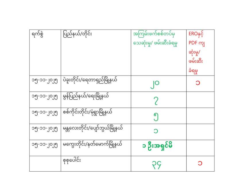 မြန်မာနိုင်ငံတစ်ဝန်း နိုဝင်ဘာလ ၁၅ ရက်နေ့ ရရှိထားသော အချက်အလက်များအရ စစ်ကောင်စီ တပ်ဖွဲ့ဝင် ၃၃ ဦး သေဆုံးကြောင်း ပြည်သူ့ကာကွယ်ရေးတပ်ဖွဲ့များ၏ ထုတ်ပြန်ချက်နှင့် ပြောဆိုချက် များ အရ သိရှိရသည်။