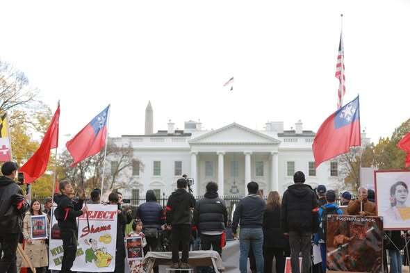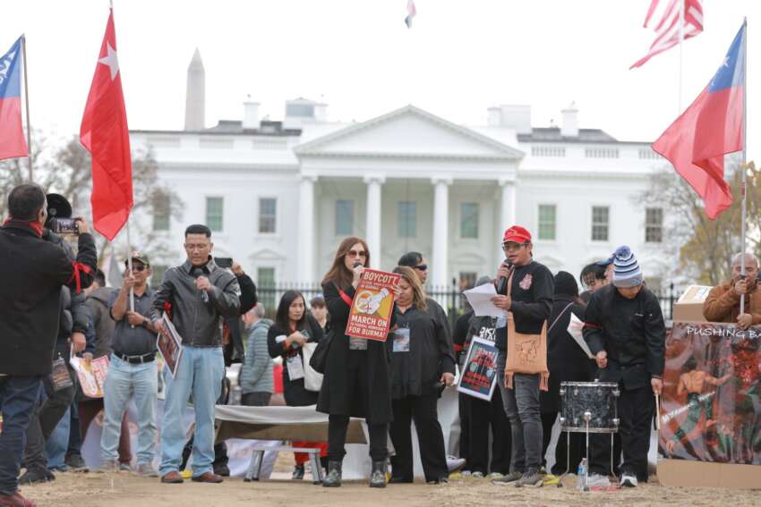 ယင်းနောက် အမေရိကန်သမ္မတ အိမ်ဖြူတော်ရှေ့သို့ သွားရောက် ဆန္ဒပြကြပြီး မြန်မာ့အရေးတွင် တရုတ်နိုင်ငံက ဝင်ရောက်စွက်ဖက်နေမှုကို ဆန့်ကျင်ခြင်း၊ စစ်တပ်၏ အတုအယောင်ရွေးကောက်ပွဲကို ဆန့်ကျင်ရေး၊ သမ္မတ ဦးဝင်းမြင့်နှင့် ဒေါ်အောင်ဆန်းစုကြည် အပါအဝင် နိုင်ငံရေး အကျဉ်းသားများ လွတ်မြောက်ရေးတို့အတွက် ကြွေးကြော်သံများ ဟစ်ကြွေး ဆန္ဒပြခဲ့ကြသည်။