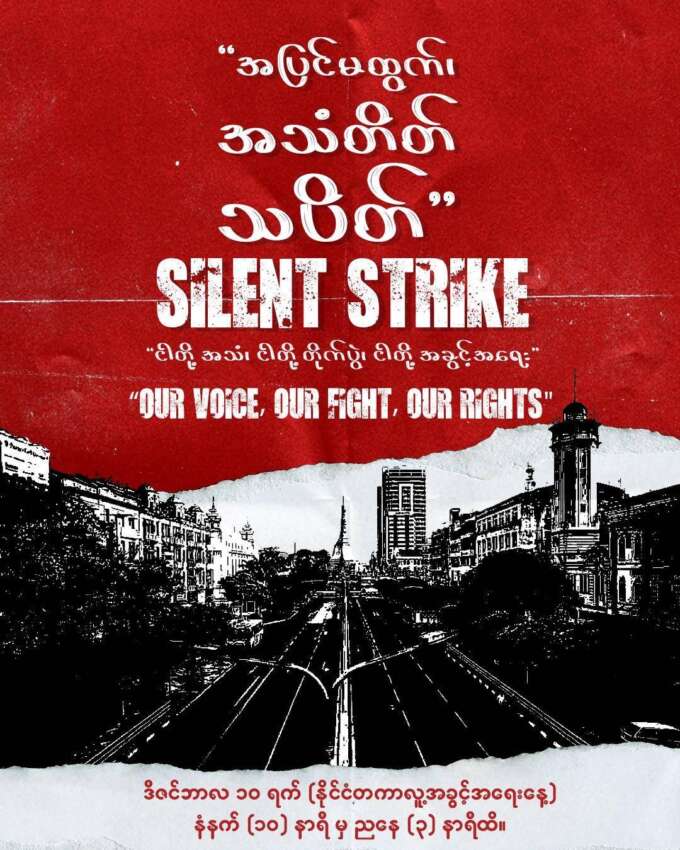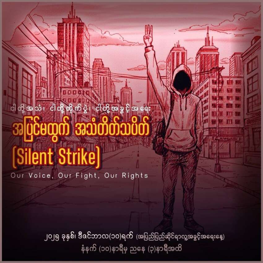 ဒီဇင်ဘာလ ၁၀ ရက်နေ့သည် အပြည်ပြည်ဆိုင်ရာ လူ့အခွင့်အရေးနေ့ဖြစ်ပြီး တစ်နိုင်ငံလုံး ပြည်သူများအနေဖြင့် “အပြင်မထွက်၊ အသံတိတ်သပိတ်ကြီး” (Silent Strike) ဆင်နွှဲကြမည်ဖြစ်ကြောင်း၊ အဆိုပါ လူထုအသံတိတ်သပိတ်က လူထုသဘောထားဖြင့် တောင်းဆိုချက်ကြီး ၃ ရပ်ကို ဖော်ထုတ် တောင်းဆိုကြမည်ဖြစ်ပြီး အဆိုပါ လူထုတိုက်ပွဲလှုပ်ရှားမှုသပိတ်တွင် ပြည်သူလူထုအားလုံး အတူတကွ ပူးပေါင်း ပါဝင်ဆင်နွှဲကြရန် တိုက်တွန်းနှိုးဆော်သည်။