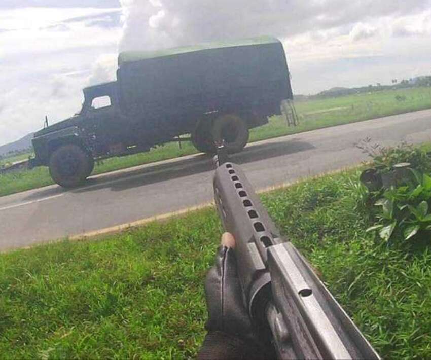 ဓာတ်ပုံ – ပြည်သူ့ကာကွယ်ရေးတပ်ဖွဲ့ဝင်များက စစ်ကားကို ပစ်ခတ်တိုက်ခိုက်နေစဉ်။ (ပုံအဟောင်းကို အသုံးပြုထားပါသည်။)