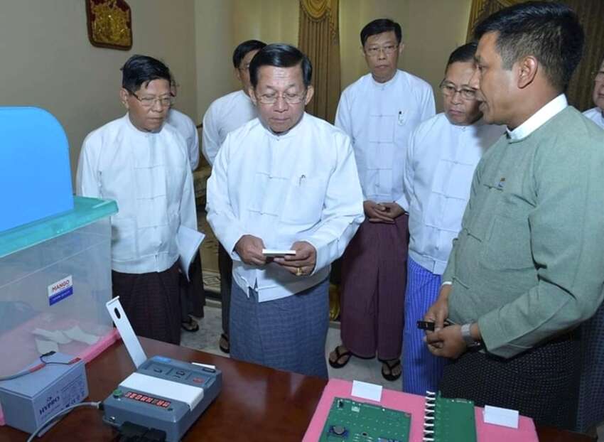 ဓာတ်ပုံ- ရွေးကောက်ပွဲအသုံးပြုမည့် အီလက်ထရောနစ် မဲပေးစက်ကို စစ်ဆေးနေသော မင်းအောင်လှိုင်။