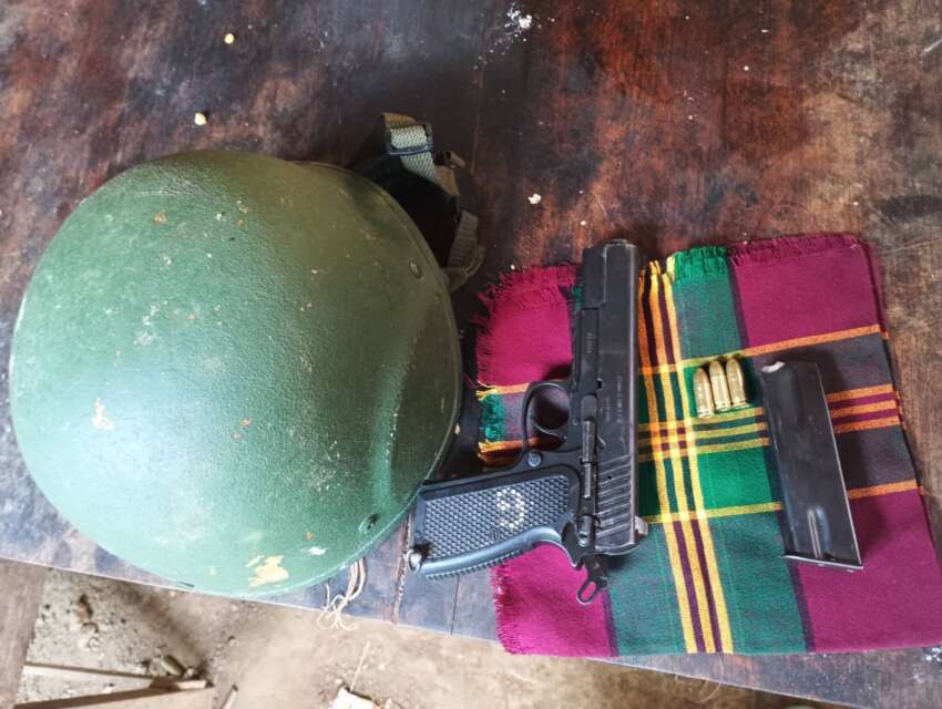 ဓာတ်ပုံ – နတ်တလင်း တိုက်ပွဲအတွင်း သေဆုံးခဲ့သော စစ်သားအလောင်းနှင့် သိမ်းဆည်းရရှိသော ပစ္စတိုသေနတ် ၁ လက်။ (ဒေသပြည်သူ ပေးပို့သည်။)