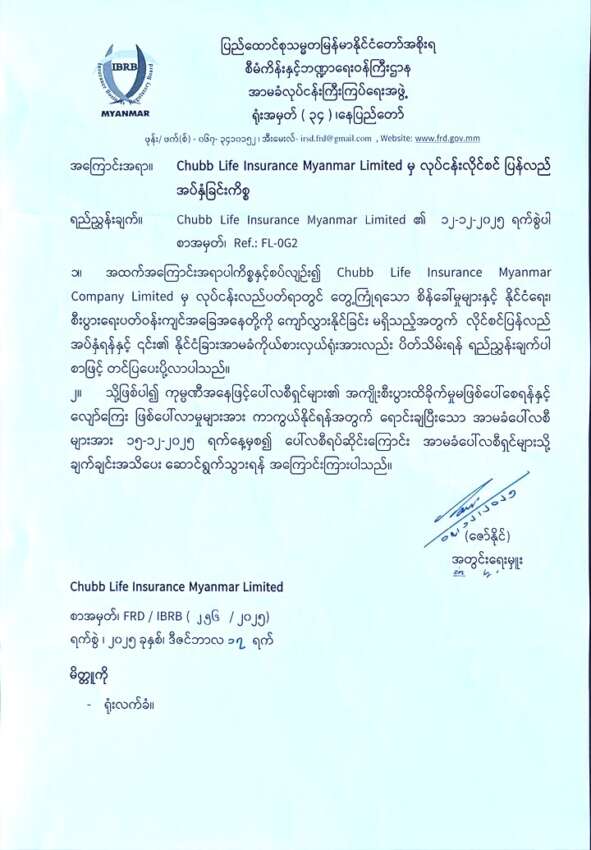 ထို့ကြောင့် NLD အစိုးရလက်ထက်က ချထားပေးခဲ့သော လုပင်န်းလိုင်စင်ကို ပြန်လည် အပ်နှံရန်နှင့် Chubb Life Insurance ၏ နိုင်ငံခြားအာမခံ ကိုယ် စားလှယ်ရုံးကိုလည်း အပြီး ပိတ်သိမ်းတော့မည်ဟု သိရှိရသည်။