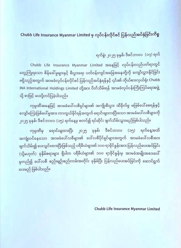Chubb Life Insurance Myanmar ကုမ္ပဏီအနေဖြင့် အာမခံထားသူများ၏ အကျိုးစီးပွားကို ထိခိုက်မှု မဖြစ်ပေါ်စေရန်နှင့် လျှော်ကြေးဖြစ်ပေါ်မှုများကို ကာကွယ်နိုင်ရန်အတွက် ရောင်းချထားပြီးသော အာမခံပေါ်လစီများကို ၂၀၂၅ ခုနှစ် ဒီဇင်ဘာလ ၁၅ ရက်နေ့မှစတင်၍ ရပ်ဆိုင်း ဖျက်သိမ်းသွားမည်ဖြစ်ကြောင်း၊ ထို့ကြောင့် အကျုံးဝင်သော အာမခံပေါ်လစီပိုင်ရှင်များအတွက် အာမခံ ပေါ်လစီများကို ဖျက်သိမ်း၍ ပေးသွင်းထားပြီးဖြစ်သည့် ပရီမီယံများ၏ ၁၀၀ ရာခိုင်နှုန်းကို ပြန်လည် ပေးအပ်ခြင်း၊ ခုနှိမ် ပြန်လည်ပေးအပ်ခြင်းများ လုပ်ဆောင်သွားမည်ဖြစ်ကြောင်း ကုမ္ပဏီက တရားဝင် ကြေညာသည်။