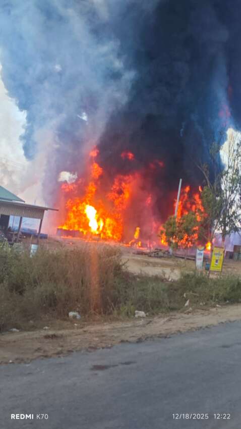 ယနေ့ ဒီဇင်ဘာ ၁၈ ရက်နေ့ မွန်းလွဲပိုင်းတွင် အကြမ်းဖက် စစ်တပ်၏ ဂျက်ဖိုက်တာ ၁ စီးနှင့် ဂျိုင်ရိုကော်ပတာ ၃ စီးသည် ခင်ဦးမြို့ မြေနီသျှို လမ်းဆုံအနီးကို ဗုံးကျဲ တိုက်ခိုက်ခဲ့ရာ ဆီခြံပေါ်ကျရောက် ပေါက်ကွဲမီးလောင်ခဲ့သောကြောင့် ရွှေဘို-မြစ်ကြီးနား လမ်းပိုင်းမှ လမ်းကြော ပိတ်မိနေသော ကားသမားများ နှင့် ခရီးသွားပြည်သူများ အပါအဝင် လမ်းဆုံအနီးရှိ ဈေးဆိုင်ရှင်များနှင့် ပြည်သူများ ထိခိုက်ဒဏ်ရာရရှိခဲ့ကြောင်း သိရသည်။