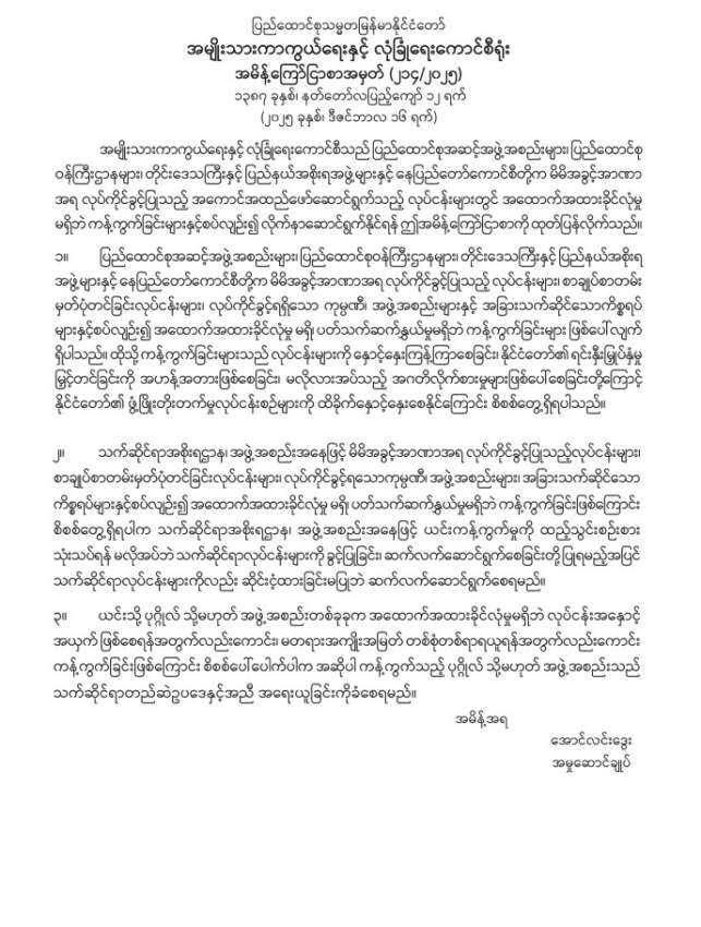 မြန်မာနိုင်ငံတွင် စစ်တပ်၊ ဝန်ကြီးဌာနများနှင့် တိုင်းဒေသကြီး/ပြည်နယ်စစ်ကော်မရှင်များက အခွင့် အာဏာအရ လုပ်ကိုင်ခွင့်ပြုသည့် လုပ်ငန်းများ၊ စာချုပ်စာတမ်းမှတ်ပုံတင်ခြင်းလုပ်ငန်းများ၊ လုပ်ကိုင်ခွင့်ရရှိသော ကုမ္ပဏီ၊ အဖွဲ့အစည်းများနှင့် အခြားသက်ဆိုင်သော ကိစ္စရပ်များနှင့်စပ်လျဉ်း၍ အထောက် အထားခိုင်လုံမှုမရှိ ပတ်သက်ဆက်နွယ်မှုမရှိဘဲ ကန့်ကွက်ခြင်းများ ဖြစ်ပေါ်လျက်ရှိကြောင်း၊ ထိုသို့ ကန့်ကွက်ခြင်းများကြောင့် လုပ်ငန်းများကို နှောင့်နှေးကြန့်ကြာစေခြင်း၊ နိုင်ငံတော်၏ ရင်းနှီးမြှုပ်နှံမှု မြှင့်တင်ခြင်းကို အဟန့်အတားဖြစ်စေခြင်းနှင့် မလိုလားအပ်သော အဂတိလိုက်စားမှုများဖြစ်ပေါ် စေကြောင်း၊ ယင်းအပြင် နိုင်ငံတော် ဖွံ့ဖြိုးတိုးတက်မှုလုပ်ငန်းစဉ်များကိုလည်း ထိခိုက်နှောင့်နှေးစေကြောင်း စစ်ကော်မရှင်က ထုတ်ပြန်သည်။