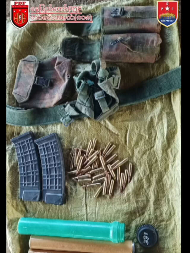 ဓာတ်ပုံ – တိုက်ပွဲအတွင်း သိမ်းဆည်းရရှိသော လက်နက်ခဲယမ်း တချို့နှင့် စစ်တပ်ပစ်ခတ်သော လက်နက်ကြီးကျည် ထိမှန်သေဆုံးခဲ့သော ပြည်သူတစ်ဦး