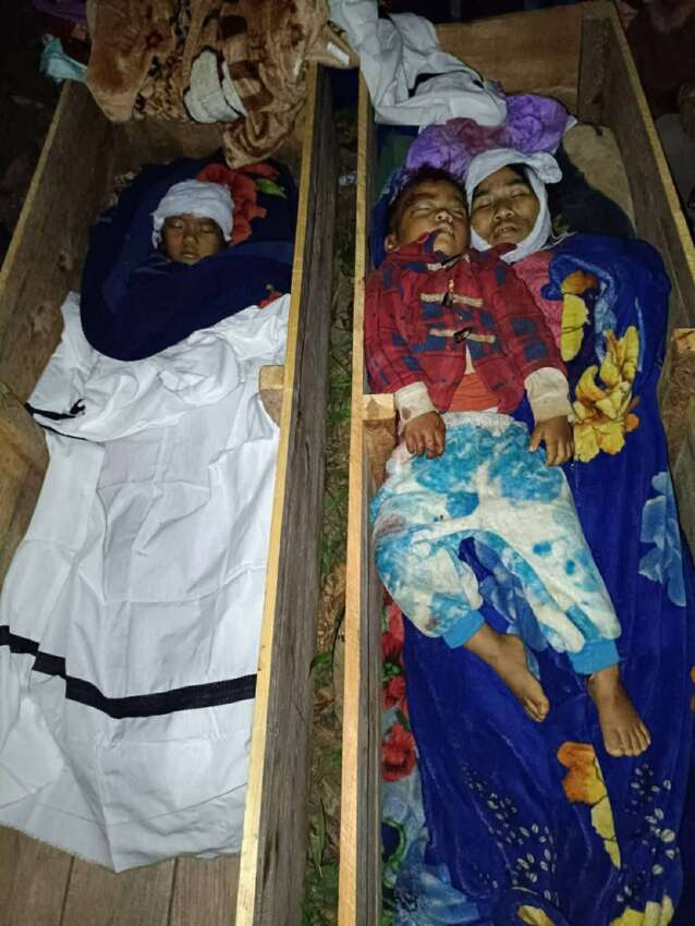 ချင်းပြည်နယ်၊ ဟားခါးမြို့နယ်သို့ တိုက်ပွဲဖြစ်ပွားခြင်းမရှိဘဲ စစ်တပ်က လေယာဉ်ဖြင့် ဗုံးကျဲမှု ကလေးငယ် ၂ ဦးနှင့်မိခင်ဖြစ်သူ သေဆုံးပြီး ဖခင်ဖြစ်သူ ဒဏ်ရာ အပြင်းအထန်ရရှိသွားကြောင်း CNA စစ်ရေး သတင်းရင်းမြစ်က ရန်ကုန်ခေတ်သစ်သတင်းဌာနထံသို့ ပြောဆိုသည်။