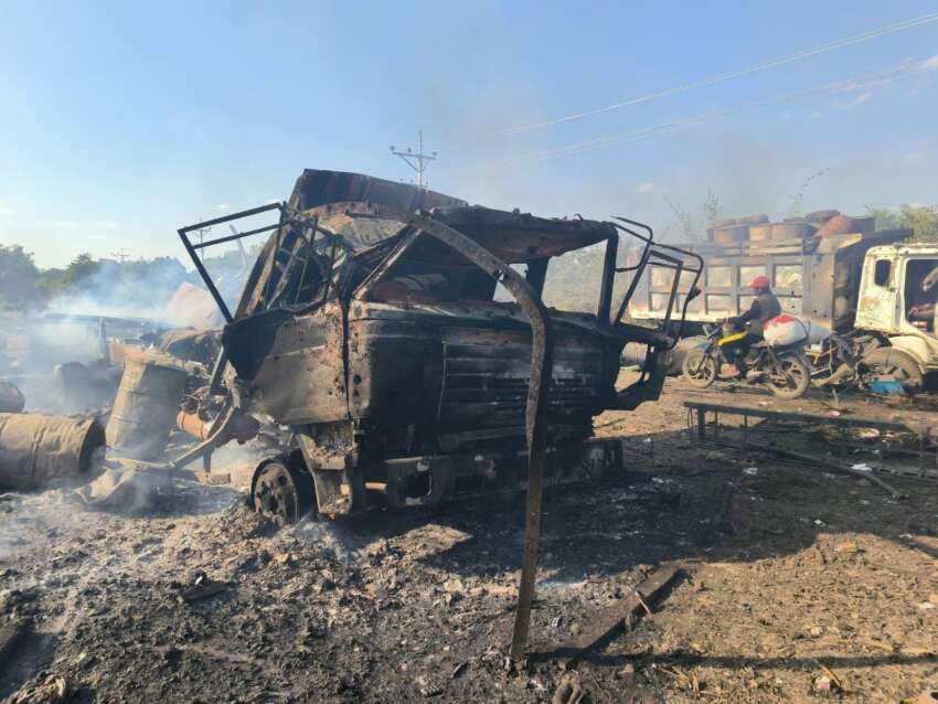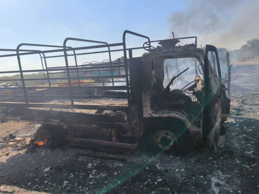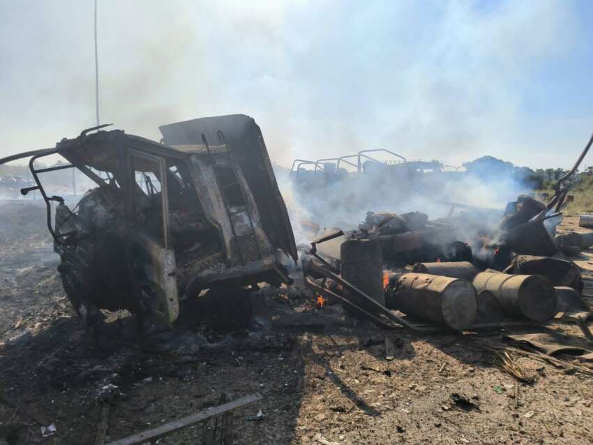 ဓာတ်ပုံ – ခင်ဦးမြို့နယ်အတွင်း စစ်တပ် လေကြောင်းတိုက်ခိုက်မှုကြောင့် မီးလောင်ပျက်စီးသွားသော ပြည်သူပိုင်ကားများ
