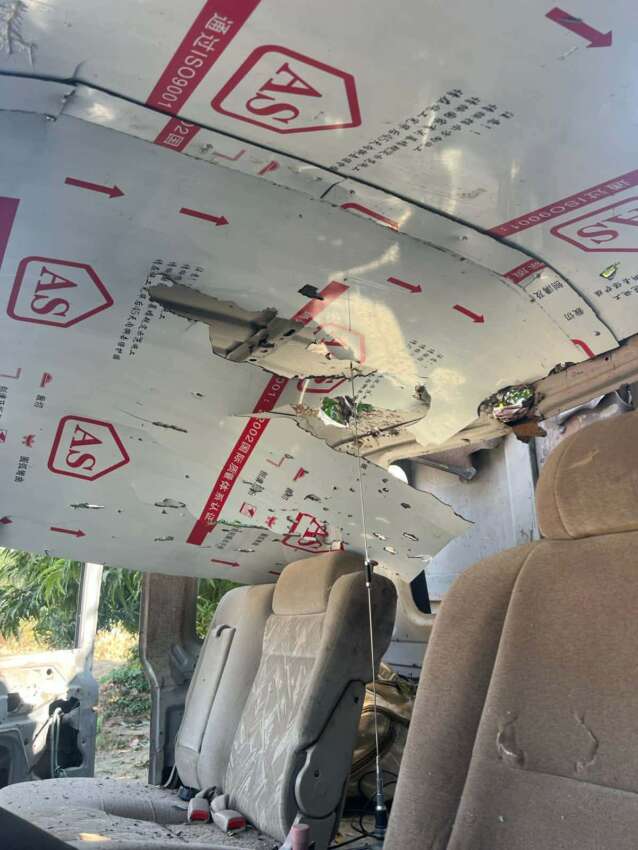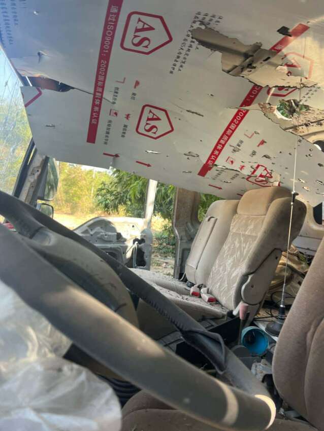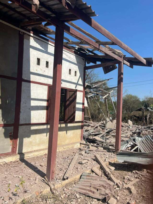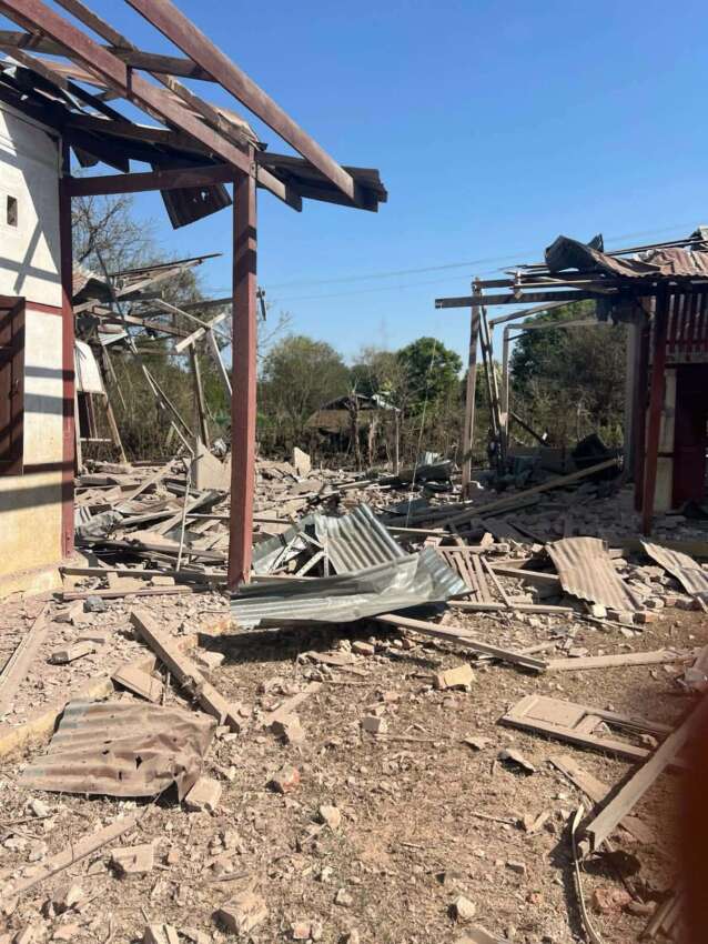 ဓာတ်ပုံ – အုန်းတပေါင်းရွာ စာသင်ကျောင်းကို စစ်တပ်က လေယာဉ်ဖြင့် ဗုံးကျဲ တိုက်ခိုက်မှု အတွင်း ပျက်စီးသွားသော ကျောင်းဆောင်နှင့် ကားတစ်စီး (မူရင်းဓာတ်ပုံ-credit)