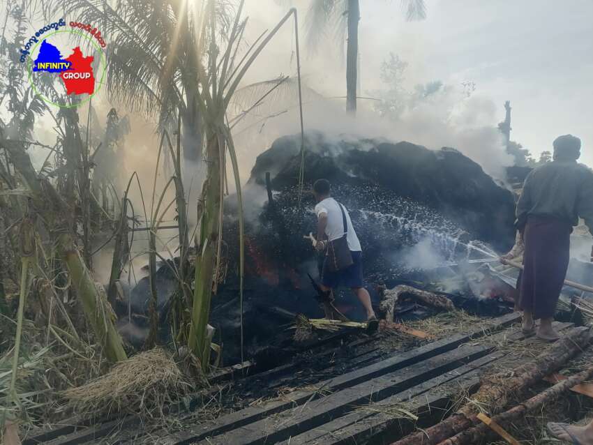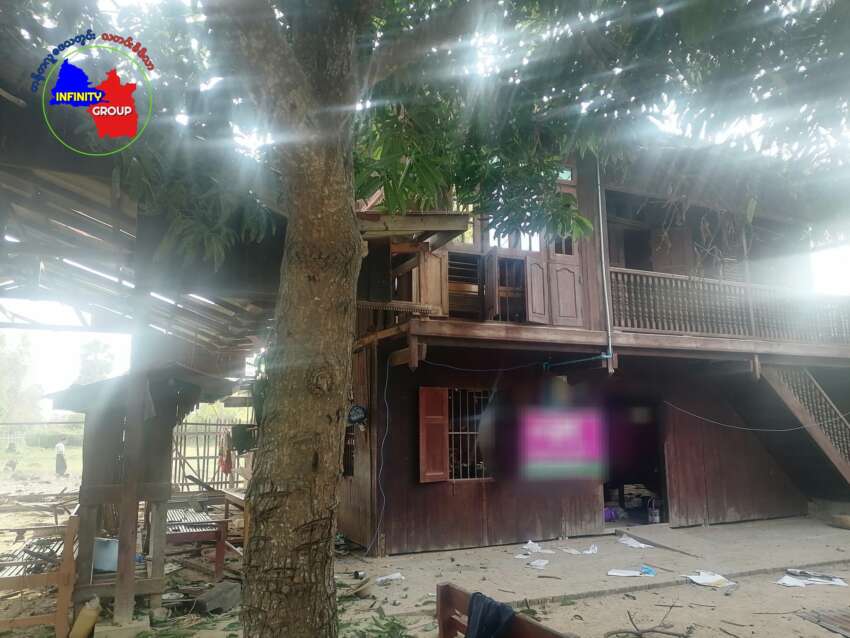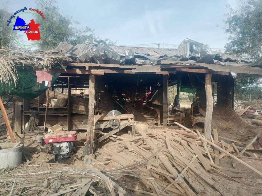 ဓာတ်ပုံ – တန့်ဆည်မြို့နယ်၊ ကော်တက်ကျေးရွာကို စစ်တပ်က လေယာဉ်ဖြင့် ဗုံးကျဲ တိုက်ခိုက်ခြင်းကြောင့် ပျက်စီးသွားသော နေအိမ်များ (photo credit-Infinity Group)
