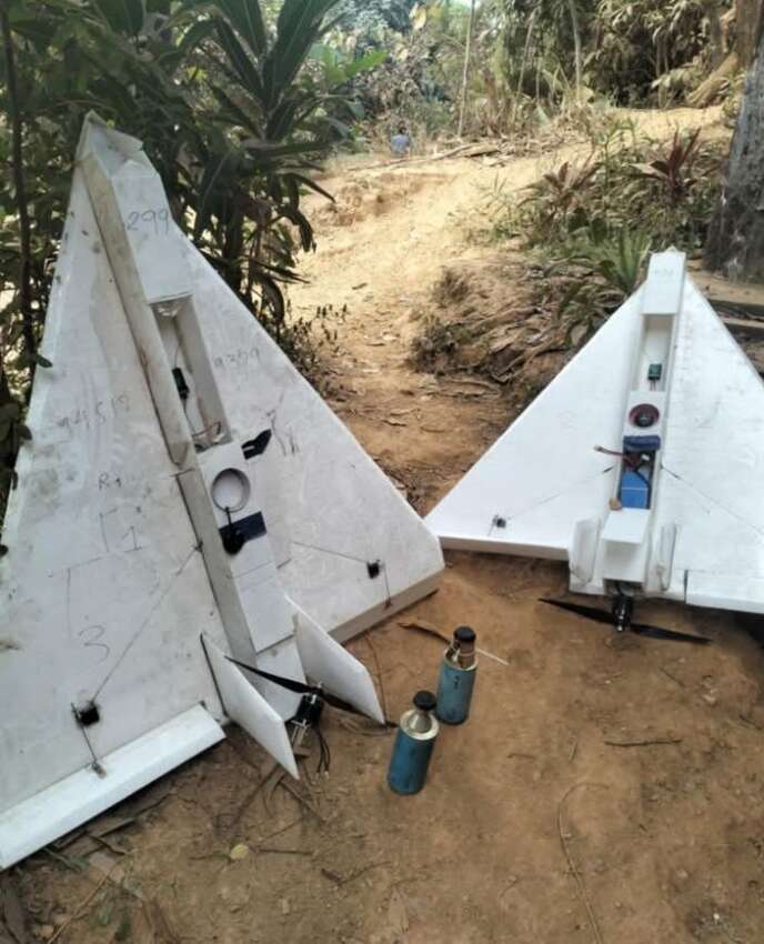 ဓာတ်ပုံ- KNU ဗဟိုဌာနချုပ်ရှိ စစ်ရေးပြကွင်းနှင့် ယခင်က တိုက်ခိုက်ရာတွင် အသုံးပြုခဲ့သော စစ်တပ်၏ အသေခံဒရုန်း အပျက်အစီးများ။ (ပုံအဟောင်းများကို အသုံးပြုထားပါသည်။)