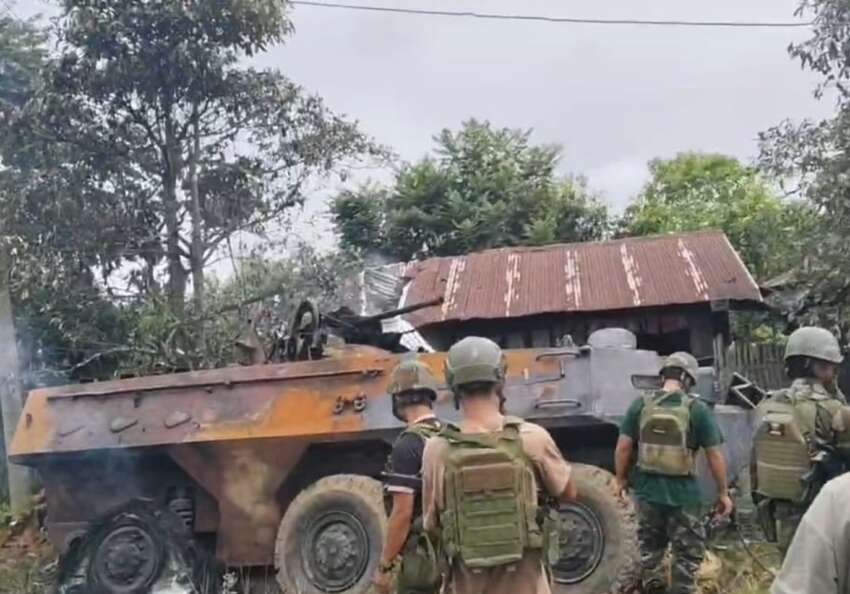 ဓာတ်ပုံ- စခန်းသိမ်းတိုက်ပွဲအတွင်း စစ်တပ်၏ တင့်ကား ၁ စီးကို KIA တပ်များက ဖျက်ဆီးထားစဉ်။ (ပုံအဟောင်းကို အသုံးပြုထားပါသည်။)