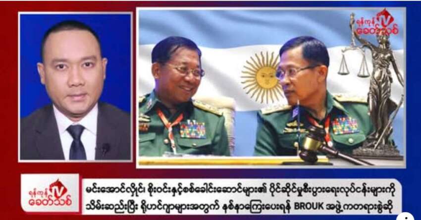 -အကြမ်းဖက် မင်းအောင်လှိုင်၊ စိုးဝင်းအပါအဝင် စစ်ခေါင်းဆောင်တွေရဲ့ ပိုင်ဆိုင်မှုတွေ ၊ စစ်တပ်ရဲ့ စီးပွားရေးလုပ်ငန်းတွေကို သိမ်းဆည်းပြီး ရိုဟင်ဂျာလူမျိုးတုံးသတ်ဖြတ်မှုက အသက်ရှင်ကျန်ရစ်သူ တွေအတွက် နစ်နာကြေးပေးဖို့ ဗြိတိန်အခြေစိုက် မြန်မာရိုဟင်ဂျာ BROUK အဖွဲ့က အာဂျင်တီးနားတရားရုံးမှာ တရားစွဲဆိုလိုက်တယ်လို့ သိရပါတယ်။