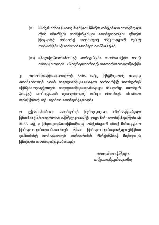 ဗမာအမျိုးသား တော်လှန်ရေးတပ်မတော် BNRA အဖွဲ့ မှ ပြစ်မှုကျူးလွန်ထားခြင်းမရှိသည့် တပ်ဖွဲ့ဝင်များကို စိတ်ဆန္ဒရှိပါက ပြည်သူ့ကာကွယ် ရေးတပ်မ တော်နှင့် ပြည်သူ့ကာကွယ်ရေးအဖွဲ့များတွင် ပူးပါင်းပါဝင်၍ တော် လှန်ရေးတွင် ဆက်လက်ပါဝင် တိုက်ပွဲဝင်နိုင်ရန် စီစဉ်သွားမည်ဟု NUG ကာကွယ် ရေးဝန်ကြီးဌာန က ကြေညာသည်။