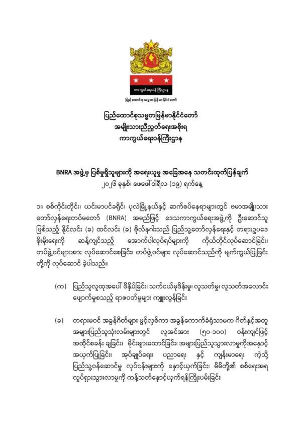 BNRA အဖွဲ့ မှ ပြစ်မှုကျူးလွန်ထားခြင်းမရှိသည့် တပ်ဖွဲ့ဝင်များကို စိတ်ဆန္ဒရှိပါက တော်လှန်ရေးတွင် ဆက်လက်ပါဝင် တိုက်ပွဲဝင်နိုင်ရန် စီစဉ်သွားမည်ဟု NUG က ကြေညာ