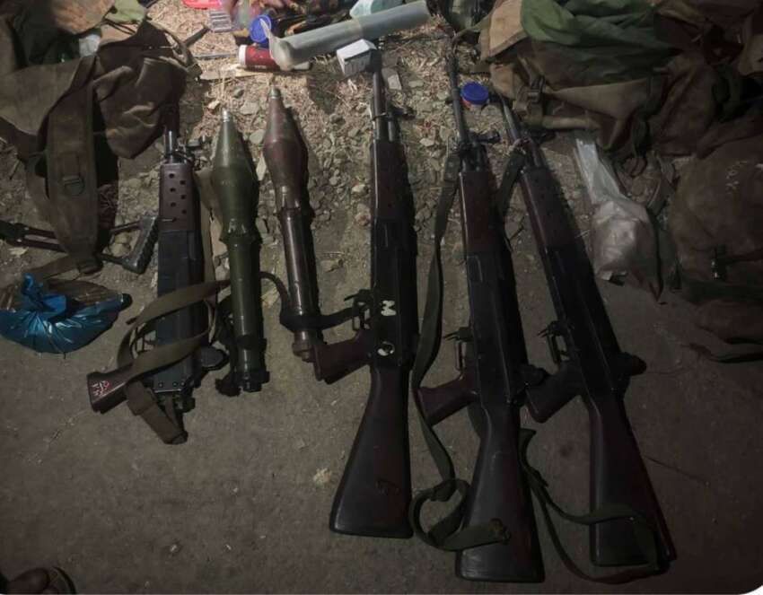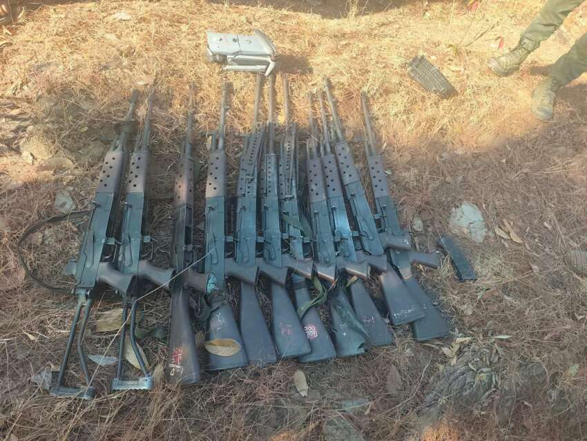ဓာတ်ပုံ- ဖလမ်းမြို့နယ်တွင် ယမန်နေ့တိုက်ပွဲနှင့် ဖေဖော်ဝါရီလ ၁၄ ရက်နေ့ တိုက်ပွဲအတွင်း ရရှိထားသော လက်နက်ခဲယမ်းများ။