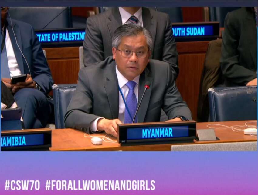 မတ်လ ၁၂ ရက်နေ့ အမေရိကန်ပြည်ထောင်စု၊ နယူးယောက်မြို့၊ ကုလသမဂ္ဂဌာနချုပ်တွင် ကျင်းပသည့် (၇၀) ကြိမ်မြောက် Commission on the Status of Women (CSW) ၏ အမျိုးသမီးများနှင့် မိန်းကလေးငယ်များအပေါ် အကြမ်းဖက်မှုဆိုင်ရာ အဆင့်မြင့်အစည်းအဝေး၌ သံအမတ်ကြီးက ထိုသို့ ပြောဆိုခဲ့ခြင်းဖြစ်သည်။