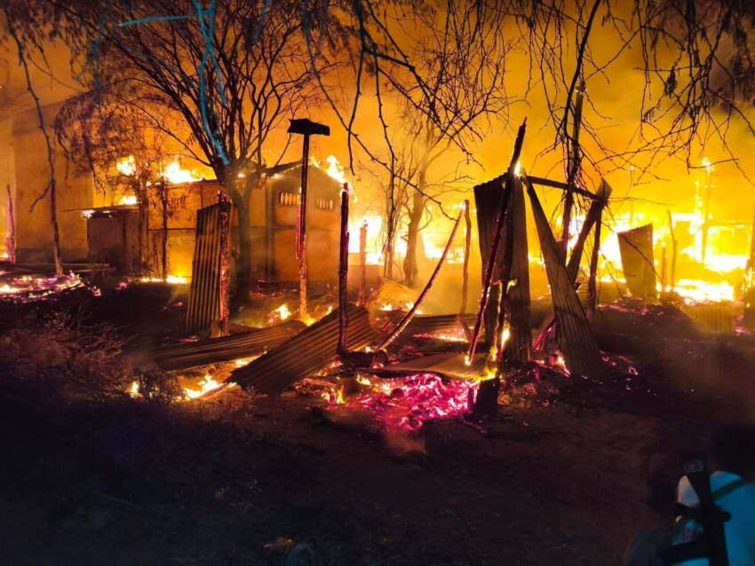 ဓာတ်ပုံ – မန္တလေးတိုင်းအတွင်းရှိ ကျေးရွာတစ်ရွာကို စစ်တပ်က လေယာဉ်ဖြင့် ညအချိန် ဗုံးကျဲ တိုက်ခိုက်ခြင်းကြောင့် နေအိမ်များ မီးလောင်နေစဉ် (ပုံအဟောင်းဖြစ်သည်)