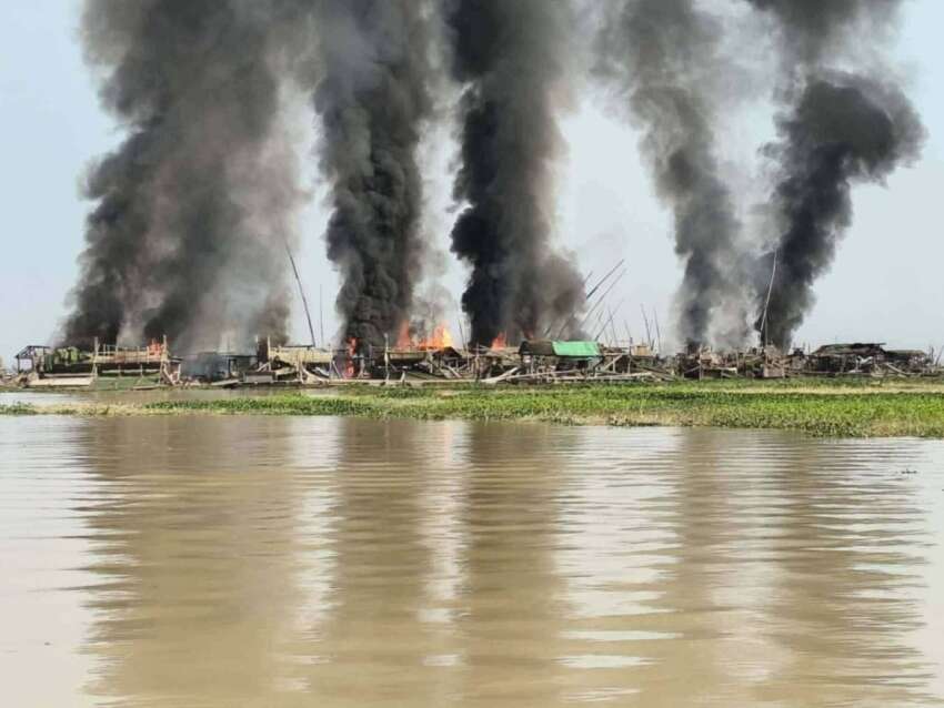 ဓာတ်ပုံ- စစ်တပ်က မတ်လ ၁၅ ရက်နေ့ ကျွန်းလှမြို့နယ်၊ သဖန်းဆိပ်ဆည်အတွင်းရှိ ရွှေမျှောဖောင်များကို လေယာဉ်ဖြင့် ဗုံးကျဲတိုက်ခိုက်ခဲ့စဉ်။