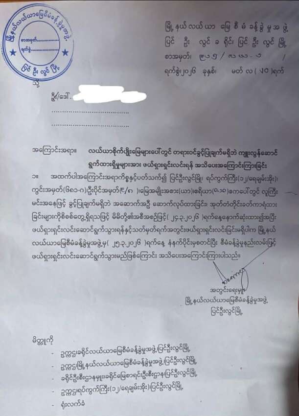 မတ်လ ၂၀ ရက်နေ့တွင် ပြင်ဦးလွင်မြို့နယ် လယ်ယာမြေစီမံခန့်ခွဲမှုအဖွဲ့က ပြင်ဦးလွင်မြို့ ရပ်ကွက်ကြီး ၁၂ ၊ ရေချမ်းအိုး ရပ်ကွက် အမှတ် (၆၈၁-ဂ) အတွင်းရှိ အဆောက်အဦးများကို မတ်လ ၂၄ ရက်နေ့ နောက်ဆုံးထား၍ အပြီးသတ် ရွေ့ပြောင်းရမည်ဟု ခြိမ်းခြောက်စာများ ပြည်သူများထံ ပို့ဆောင်ခဲ့ကြောင်း၊ ထိုသို့ သတ်မှတ်ထားသော ရက်ကို ကျော်လွန်၍ ပြောင်းရွေ့ခြင်းမရှိပါက အကြမ်းဖက် စစ်တပ်က မတ်လ ၂၅ ရက်နေ့ နံနက်ပိုင်းတွင် အင်အားသုံး၍ နေအိမ်များကို ဖျက်ဆီးသွားမည်ဟု ခြိမ်းခြောက်စာတွင် ဖော်ပြထားကြောင်း သိရှိရသည်။