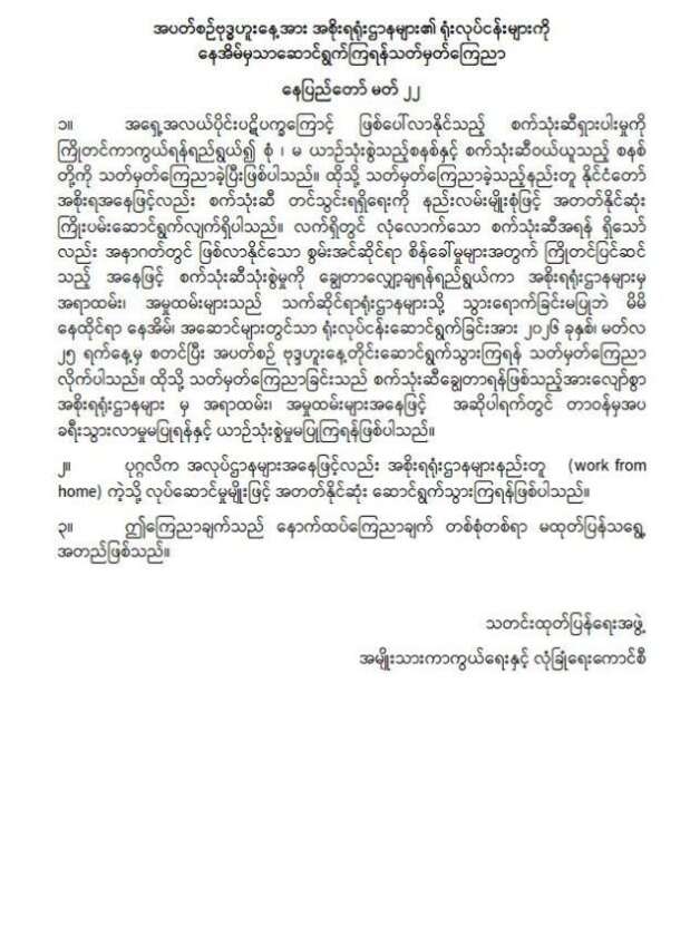ထို့ပြင် ပုဂ္ဂလိက အလုပ်ဌာနများအနေဖြင့်လည်း အစိုးရရုံးဌာနများနည်းတူ (work from home) ကဲ့သို့ လုပ်ဆောင်မှုမျိုးဖြင့် အတတ်နိုင်ဆုံး ဆောင်ရွက်သွားကြရန်နှင့် အဆိုပါ ကြေညာချက်သည် နောက်ထပ် ကြေညာချက် တစ်စုံတစ်ရာ မထုတ်ပြန်သရွေ့ အတည်ဖြစ်ကြောင်း ဖော်ပြထားသည်။