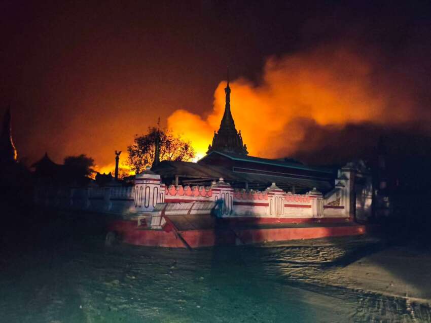 ဓာတ်ပုံ – မန္တလေးတိုင်း အတွင်းရှိ ကျေးရွာ တစ်ခုကို အကြမ်းဖက် စစ်တပ်က ညအချိန် လေယာဉ်ဖြင့် ဗုံးကျဲ တိုက်ခိုက်ခြင်းကြောင့် နေအိမ်များ မီးလောင်နေစဉ် (ပုံအဟောင်းဖြစ်သည်)