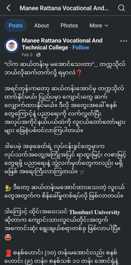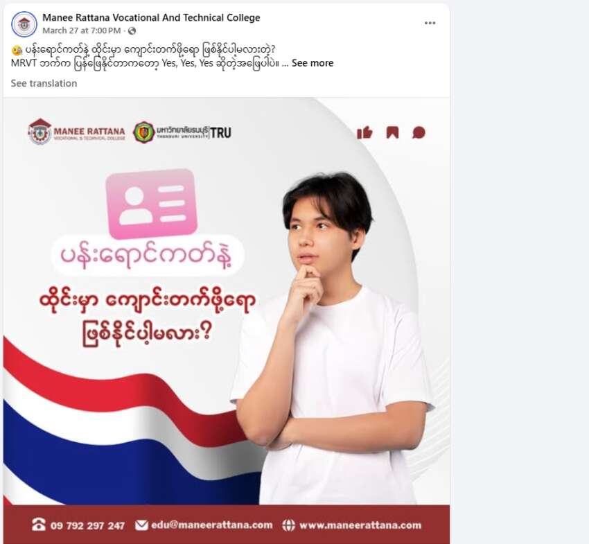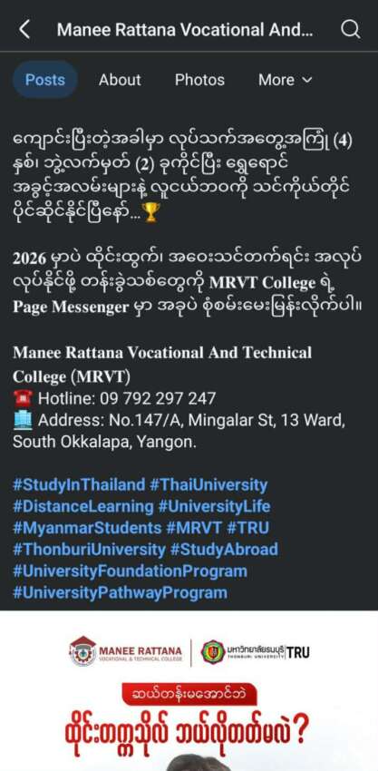 ထိုင်းနိုင်ငံတွင် အလုပ်လုပ်ရင်း အဝေးသင်ပညာသင်ရင်း ဘွဲ့ယူနိုင်ခြင်း၊ အလုပ်သမား ပန်းရောင်ကတ်ဖြင့် ပညာသင်ယူနိုင်ဟုဆိုကာ ကျောင်းသားရာချီကို ဝန်ဆောင်ခအများအပြား ရယူ ပို့ဆောင်ခဲ့သော Manee Rattana Vocational and Technical College (MRVT College) – MRVT ကျောင်းကြောင့် ကျောင်းသားကျောင်းသူ တချို့ ဒုက္ခရောက်နေကြောင်း အဆိုပါကျောင်းမှ ကျောင်းသားကျောင်းသူတချို့က ရန်ကုန်ခေတ်သစ်သတင်းဌာနထံသို့ ပြောဆိုသည်။