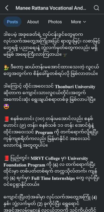ထို့အပြင် လက်ရှိအချိန်တွင်လည်း MRVT College မှတဆင့် ထိုင်းနိုင်ငံရှိ Thonburi University တွင် တက်ရောက်ပညာသင်ကြားနေကြသော ကျောင်းသူကျောင်းသား အမြောက်အမြားရှိနေပါသည်။ MRVT College အနေဖြင့် ထိုင်းနိုင်ငံ Thonburi University တွင် တက်ရောက်နေသော ကျောင်းသူကျောင်းသားများကို တရားမဝင်သော မှောင်ခိုအလုပ်များ လုပ်ကိုင်စေခြင်း လုံးဝ (လုံးဝ) မရှိပါ။ ထိုကဲ့သို့သော တရားမဝင်မှောင်ခိုလုပ်ကိုင်သော ကျောင်းသူကျောင်းသားများကိုလည်း ထိုင်းနိုင်ငံရှိ Thonburi University မှ Internship Letter ထုတ်ပေးခြင်း လုံးဝ (လုံးဝ) မရှိပါ။”ဟု ပြောဆိုသည်။