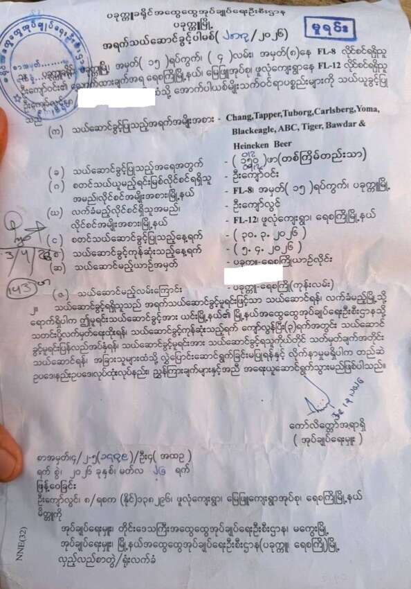 အဆိုပါ ပစ္စည်းများသည် ခလရ ၂၅၇ တပ်ရင်းမှ အငြိမ်းစားယူထားသည့် အရာခံဗိုလ် ကျော်လွင် ပိုင်ဆိုင်သော “ဧဒင်နန်း” အရက်ဆိုင်သို့ ပို့ဆောင်မည့် ပစ္စည်းများဖြစ်ကြောင်း စစ်ဆေးတွေ့ရှိခဲ့ရသည်။