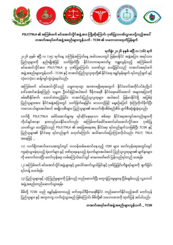 PSLF/TNLA အနေဖြင့် မင်းအောင်လှိုင်ကို ဂုဏ်ပြုခြင်း၊ ပူးပေါင်းဆောင်ရွက်ခြင်းကို ချက်ချင်းရပ်တန့်ပြီး လူထုယုံကြည်မှုကို ပြန်လည်တည်ဆောက်ရန် တအာင်းအရပ်ဖက်အဖွဲ့အစည်းများ ကွန်ယက် – TCSN က ယနေ့ ဧပြီလ ၁၆ ရက်နေ့တွင် ထုတ်ပြန် တိုက်တွန်းလိုက်သည်။