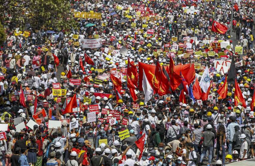ဓာတ်ပုံ- ၂၀၂၁ ခုနှစ် စစ်အာဏာရှင် ဆန့်ကျင်ရေးဆန္ဒပြပွဲ။ Photo- AP ။